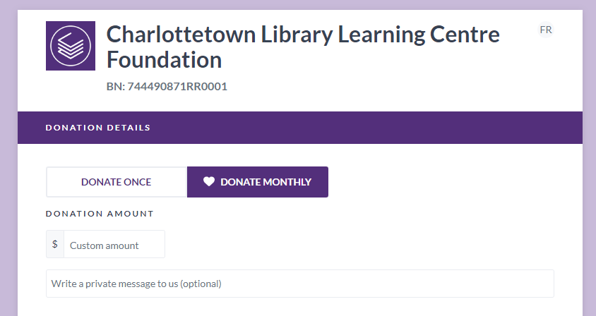 Provide consistent funding to help the Charlottetown Library Learning Centre continue to provide quality resources and programs with a recurring monthly gift. Donations can be made online through Canada Helps.